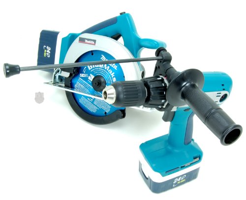 FACTORY RECONDITIONED Makita Cordless Driver Drill and Cordless Circular Saw Combo Kit Model # DK2402HF. This combo kit from Makita includes a 7-1/4-inch cordless circular saw and a 1/2-inch cordless drill/driver. Both tools feature a powerful 24-volt (1.7 Ah) Nickel-Metal Hydride Battery for longer run time, and a high performance, long lasting Makita motor. The saw, with its huge 7-1/4-inch blade, cuts 2x material at 45 degrees, crosscuts up to 51 two-by-fours on a single charge, and has a 50-degree bevel capacity with a positive stop at 45 degrees. The Model BDF460 drill/driver has 18 torque settings, delivers up to 476 in./lbs. of torque, and is well balanced for easy handling. The ergonomic rubber grip gives you positive control and maximum comfort. It also features two-speed gear selection (0-460 rpm or 0-1,500 rpm), electric brake, an industrial metal gear housing for durability along with externally accessible brushes, and a single sleeve 1/2-inch keyless chuck with shaft lock for fast and easy one-hand installation. Comes with MAKITA FACTORY 1 YEAR TOOL WARRANTY